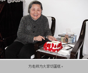 探望组如约到达畅春园时,方老师已等待多时。她很开心的叫来了住在对面的李玲君老师,一起分享生日蛋糕。虽已至耋耄之年,方老师仍神采奕奕,言谈间透漏出开朗洒脱,乐观豁达。方老师已退休多年,但她仍然关注着院系的动态。闲聊时她提起幼年、童年时期都在动荡不安、四处搬迁中度过,又经历过20世纪六、七十年代在江西鲤鱼洲艰苦的岁月,相比之下,现在的生活幸福而知足。方老师还和李玲君老师交流了种瓜种菜伺弄花草的经验,小小的客厅内欢声笑语其乐融融。