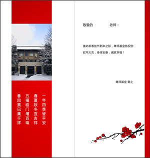 校友尊师基金为到会的每一位老师送上了特别设计的新年贺卡,恭祝老师们蛇年大吉、身体安康、阖家幸福。贺卡受到了老师们的真诚赞美,有的老师拿到之后就迫不及待的打开仔仔细细欣赏一遍,还有的老师特别要求给不方便前来参会的离退休老师带一张贺卡回去。到场的许多老师对尊师基金已经十分熟悉,去年的教师节茶话会给老师们留下了十分深刻的印象。