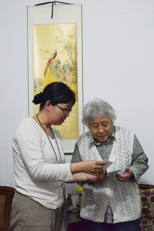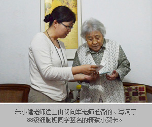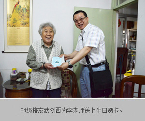 李老师住在蔚秀园小区一栋小楼的一层,室外有一个小小的花园,种满了她的孩子们送来的花花草草,不大的花园里生机盎然。我们到达时,李老师正和武剑西校友隔着栏杆聊天。李老师把我们让进了干净整齐的客厅,武剑西校友作为基金捐赠人代表尊师基金送上生日贺卡,并代为转达了80级校友项欣对李老师的祝福。佟向军校友送上了一大捧鲜花,朱小健老师则拿出了由佟向军老师准备的、有班上许多同学签名的精致小贺卡。尤为贴心的是,朱小健老师还带来了同学们的录音及录像。他们有的在大洋彼岸,有的在南国春城,虽不能亲自前来,但仍以视频和录音的形式,向李老师送上问候和祝福。李老师带上老花镜,在电脑前仔细地分辨着这些久未谋面的脸庞,悄悄地拭去眼角的泪花。这些来自异国他乡的饱含深情的祝福,是老师们听到的最动听的语言。
