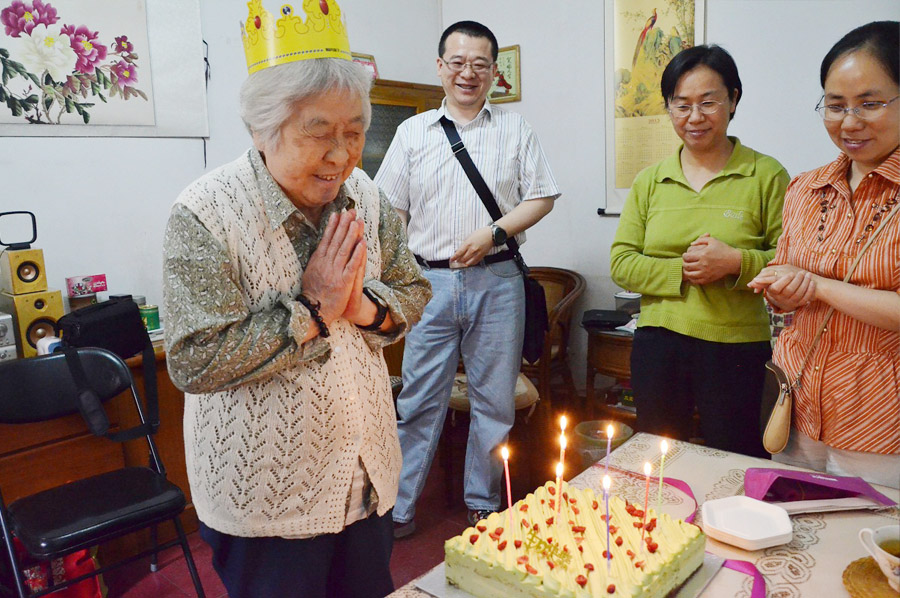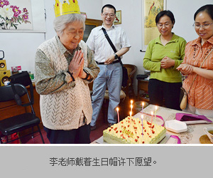 庆祝生日,吃蛋糕是必不可少的环节。李老师在我们的簇拥下戴上生日帽,依次点燃蜡烛,大家唱响生日歌,李老师认真地许了愿,吹灭了蜡烛。跳跃的烛光映着她的满头银发,也映亮了她如孩童般的笑脸。从这笑容里,我们再一次感受到校友们的关心给老师们带来的不可替代的幸福感和满足感,也更加深刻的体会到尊师基金所做一切的深远意义。