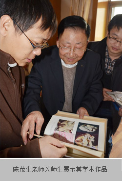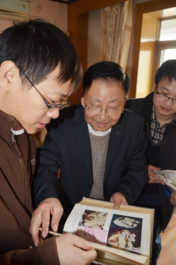 时值新春佳节前夕,一行人早早出发,带着最诚挚的祝福来到陈老师家。一上楼就看到陈老师早已开门等候着大家的到来。众人首先为陈老师送上写满海内外学子和老师们深切祝福的贺卡,并在落座后为陈老师拿出带来的生日蛋糕,点燃蜡烛,唱起生日歌,为陈茂生老师庆生。当陈老师得知自己是尊师基金送上2015年生日祝福的第一人时,显得十分惊喜和感动,连连对在场的师生表示着感谢。品尝完美味的蛋糕,陈茂生老师热情地为大家讲述着自己退休前后的教学和科研经历,他时而介绍自己参与编写的各类基础教材与专业书籍,时而拿出自己珍藏多年的组织切片标本供大家欣赏,点滴话语间,陈老师几十年潜心钻研的一幕幕场景顿时呈现在我们面前,更令大家对面前的这位老人产生了由衷的钦佩之情。