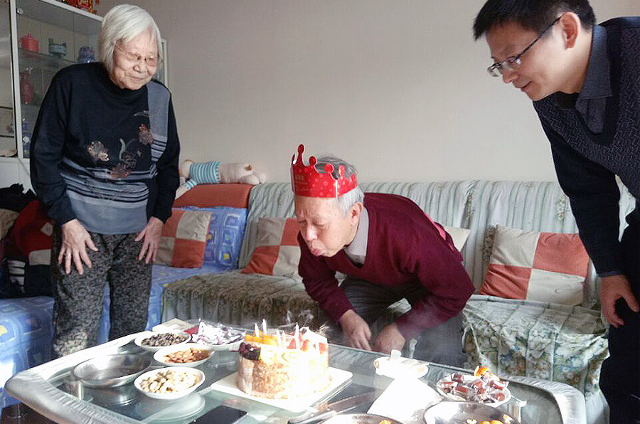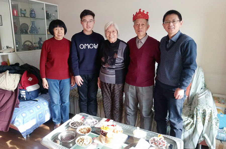 一行人的到来令高老师非常高兴,他亲自下楼迎接前来祝寿的老师和同学们,并为大家准备了精美可口的茶点。进门后,大家首先向高老师送上校友尊师基金精心准备的生日蛋糕和贺卡,随后高老师热情地招呼大家坐下并拉起了家常。高老师虽然退休多年,但依然十分关心学院的发展,他与众人分享了自己在北大上学时的趣事和工作的经历,鼓励同学们要严格要求自己,敢于承担责任,积极回报社会。高老师对科研学术与教育事业的热爱和浓浓的奉献精神令大家十分感动和钦佩。临近中午,大家为高老师齐唱生日歌,一同切好生日蛋糕,共祝高老师生日快乐。